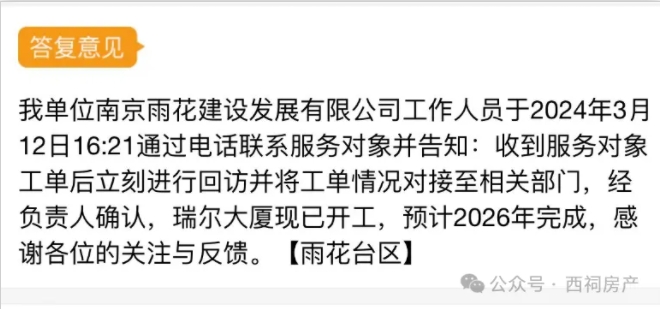 今年3月,西祠房产曾咨询官方,官方表示瑞尔大厦已开工,预计2026年完成。