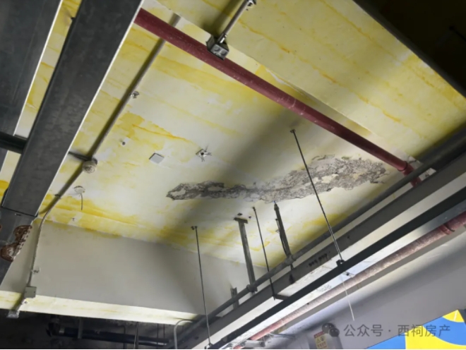 商场地库看起来更加“触目惊心”,地库发霉、掉皮,甚至还有大面积水滩。