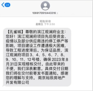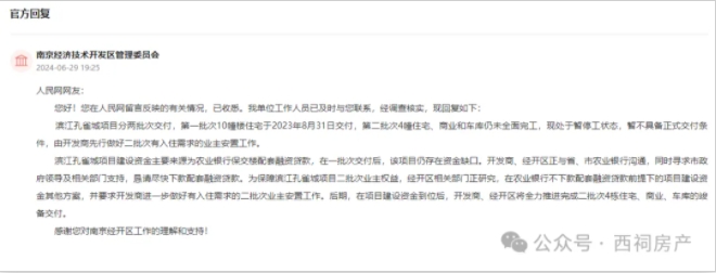 6月29日,南京经济技术开发区管理委员会表示,滨江孔雀城第二批次4幢住宅、商业和车库仍未全面完工,现处于暂停工状态,暂不具备正式交付条件,该项目仍存在资金缺口,已要求开发商进一步做好有入住需求的二批次业主安置工作。