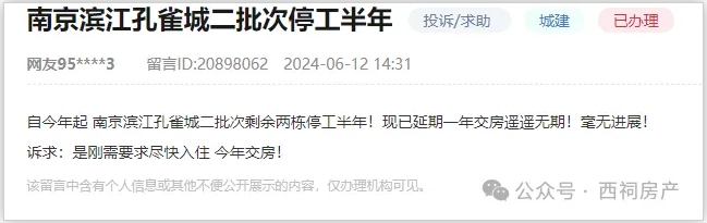 近日,有网友在领导留言板上表示,自今年起 南京滨江孔雀城二批次剩余两栋停工半年,现已延期一年交房遥遥无期,毫无进展!