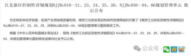 7月3日,《南京江北新区控制性详细规划》NJJBc010—21、23、24、25、26和NJJBc030—04、06规划管理单元图则批后公,本次调整为支持实体经济发展,促进产业用地高质量利用。