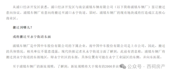 据现代快报消息,浦口经济开发区与南京浦镇车辆有限公司签订搬迁意向协议。浦镇车辆厂有意向将搬迁至浦口永宁街道。此前有消息称,浦镇车辆厂将搬迁到永宁街道的东部地区,即永宁社区的东部,具体位置有可能在永宁工业园区的东侧,并向东拓展。浦镇车辆厂新址规模将大于现有的2000多亩地。