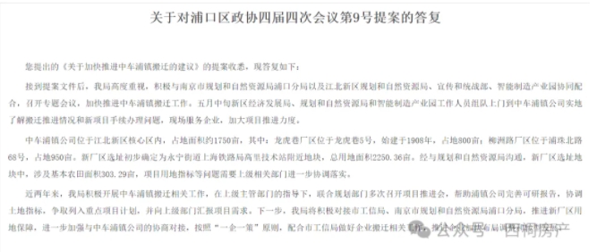 2020年7月29日,“关于对浦口区政协四届四次会议第9号提案的答复”,南京市江北新区管委会经济发展局表示:中车浦镇公司位于江北新区核心区内,占地面积约1750亩,其中:龙虎巷厂区位于龙虎巷5号,始建于1908年,占地800亩;柳洲路厂区位于浦珠北路68号,占地950亩。新厂区选址初步确定为永宁街道上海铁路局高里技术站附近地块,总用地面积2250.36亩。经与规划和自然资源局沟通,新厂区选址地块中,涉及基本农田面积303.29亩,项目用地指标等问题需要上级相关部门进一步协调落实。