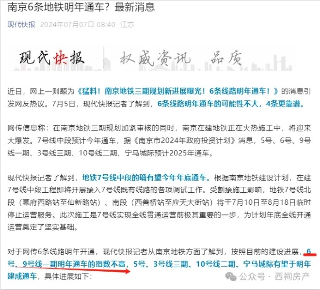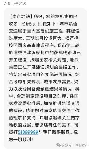 对此,西祠房产向南京地铁咨询,南京地铁回复称,我市第二轮轨道交通建设规划中的获批线路均已开工建设,按照国家相关规定,地铁集团正在开展建设规划的编报工作,将结合获批项目的实施进展情况,综合考虑相关规划、城市发展需要、财力以及线网客流预测结果等情况,科学、合理制定建设项目及时序,经国家发改委批准后,加快推进轨道交通的建设。