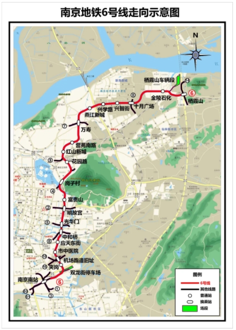 南京地铁6号线全长32.365千米,起于南京南站,自西南向东北经过秦淮、玄武、栖霞三区及南部新城、南京经济技术开发区,止于栖霞山站,全长32.365km,共设站点19座。