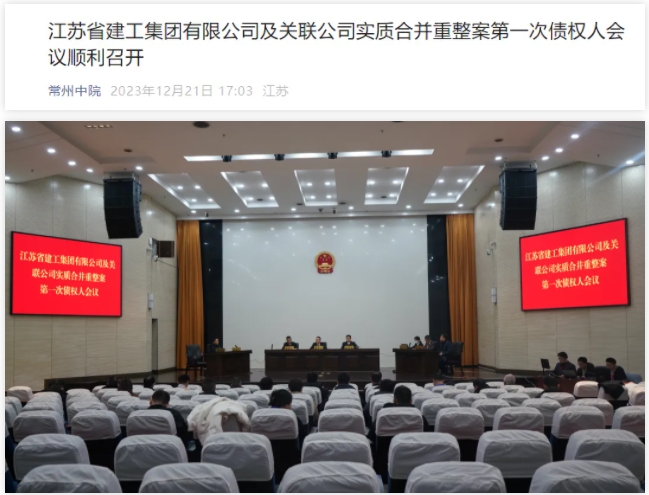 2023年12月20日下午,江苏省建工集团有限公司及关联公司(以下简称江苏省建工系公司)实质合并重整案第一次债权人会议在溧阳市人民法院第一审判庭召开。本次会议由溧阳市人民法院依法主持,江苏省建工系公司管理人及943户债权人通过线上+线下方式参加了会议。