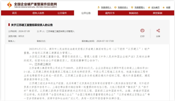 为实现江苏建工重整价值,需要进投资人,管理人依据《中华人民共和国企业破产法》及相关法律的规定,拟面向社会公开招募投资人。