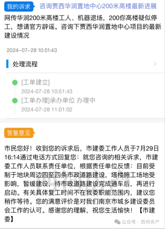 雨花核心区第一高楼究竟是什么情况?7月29日,南京市建委回复称:目前受制于地块周边四至四条市政道路建设,塔楼施工场地受影响,暂缓建设,待市政道路建设完成通车后,再进行启动。有关具体复工时间不在南京市建委职能范围内,建议稍作等待。