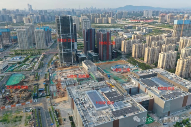 位于I地块的3栋公寓楼基本已经完工,预计今年年底交付;F地块的2栋150米、120米办公楼也已基本完工,正在张贴玻璃外墙。