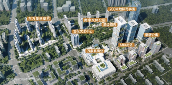 华润置地中心项目分为11个地块开发,其中 ABCD为住宅地块(即华润云上润府,规划建设18栋28F-33F高层住宅),总建面约23万方;剩余 E-K 地块是商办地块,总建面约52万方, 其中包括万象系商业、文体中心、科学家公园、创客西街、高端公寓、星级酒店以及一座200米的雨花地标构成。