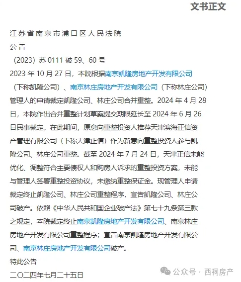 2024年7月25日, 南京市浦口区人民法院发布公告,宣告南京凯隆房地产开发有限公司、南京林庄房地产开发有限公司破产,经管理人审查确认的债权人共87户,确认债权总额约为54.54亿元。