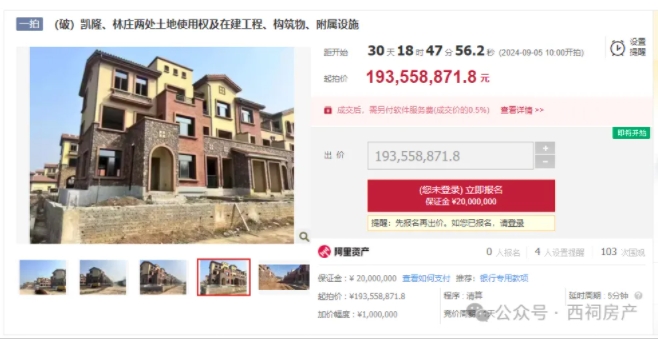 近日,阿里法拍上架了“(破)凯隆、林庄两处土地使用权及在建工程、构筑物、附属设施”项目,该项目起拍价约为1.94亿元,拍卖保证金为2000万元,增价幅度为100万元,竞价时间为2024年9月5日10时至2024年9月6日10时止。