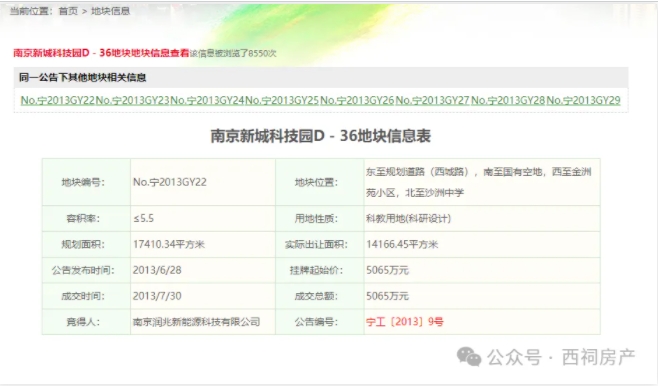南京土地市场网信息显示,2013年7月30日,南京润兆通过招拍挂以5065万底价拿下新城科技园D-36地块,容积率5.5。