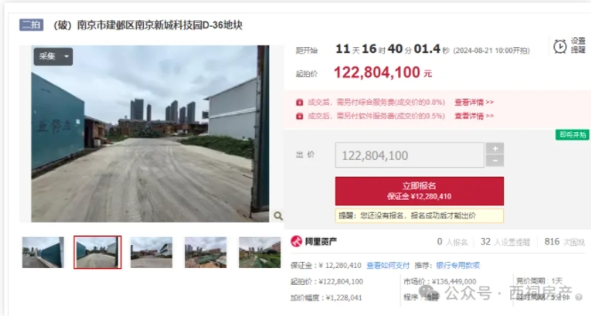 近期,阿里法拍上架了“南京市建邺区南京新城科技园D-36地块”,土地性质为科教用地(科研设计),面积约14166.54㎡,地块市场评估价约1.36亿(土地评估价值为7485.55万;宗地内基坑支护、土方和桩基工程评估价值为6159.35万),起拍价约1.23亿,相当于打了9折。