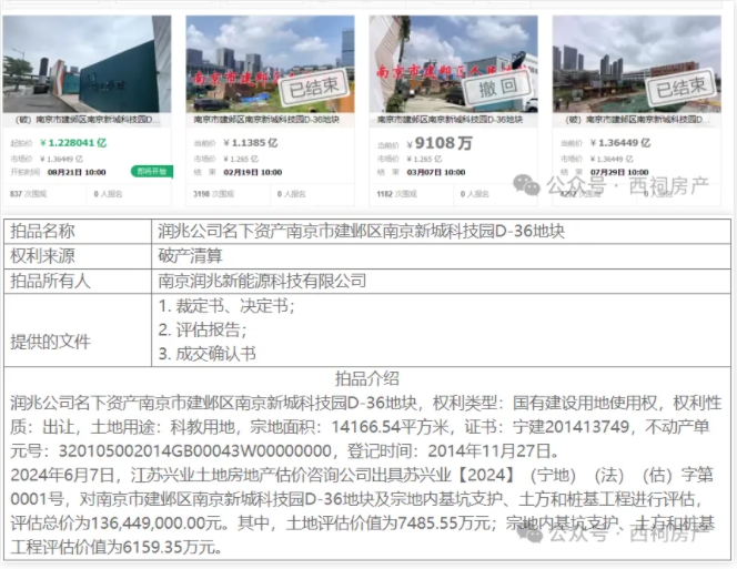 因地块开发商南京润兆新能源科技有限公司(下称南京润兆)破产,该地块被拿出来拍卖!此次已是进入破产清算阶段的第二次拍卖!7月29日该地块1.36亿原价拍卖遭遇流拍!早在今年2月初,南京市建邺区人民法院将该幅地块1.1385亿法拍,一拍流拍后,3月底二拍起价9108万抛售,后因故撤回。