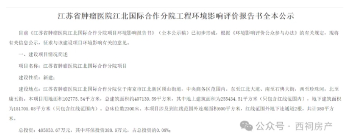 2021年7月16日,江苏省肿瘤医院江北国际合作分院工程环境影响评价报告书全本公示。报告显示,项目总投资485853.67万,用地面积102775.54㎡,总建筑面积约407139.59平方米㎡,总床位数2300床,建设周期为2021年6月-2024年5月,共计36个月。