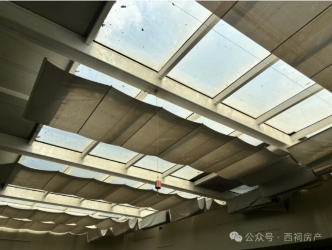 商场顶楼的玻璃穹顶发黄、积灰,疑似许久无人打理。