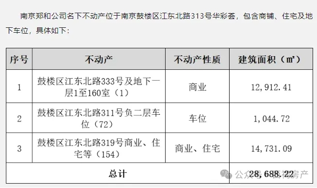 据中国中信金融资产江苏分公司官微显示,经南京中院裁定,金盛置业投资集团有限公司等28家公司已进入破产重整,根据重整计划,南京郑和公司名下不动产位于南京鼓楼区江东北路313号华彩荟,包含商铺、住宅及地下车位或将面临处置。
