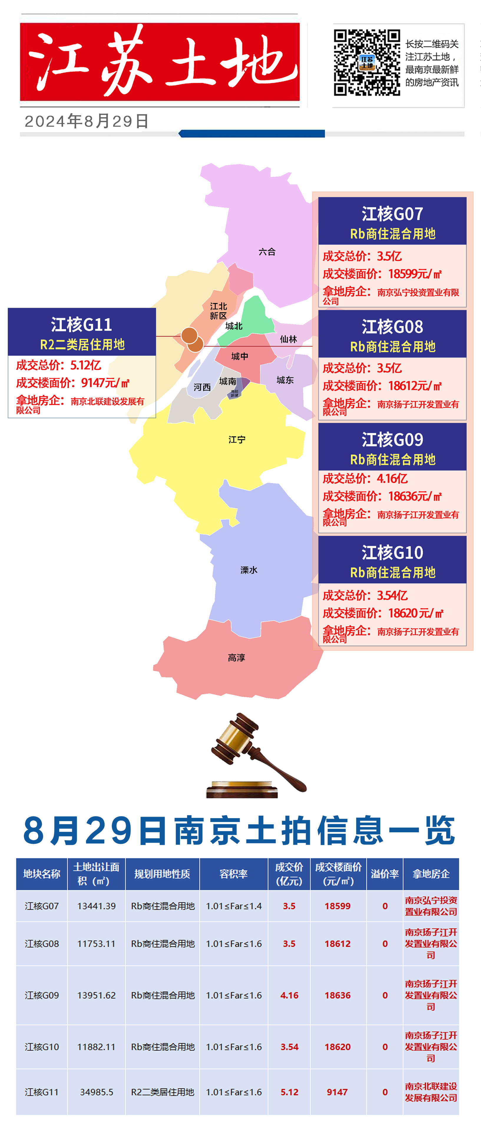 江核G07地块,底价成交,拿地房企为南京弘宁投资置业有限公司,成交总价3.5亿元,成交楼面价18599元/㎡。
