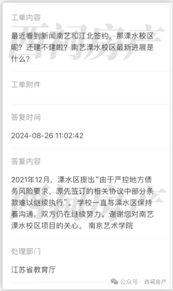 8月26日,南京艺术学院回复称,2021年12月,溧水区提出“由于严控地方债务风险要求,原先签订的相关协议中部分条款难以继续执行”。学校一直与溧水区保持着沟通,双方仍在继续努力。