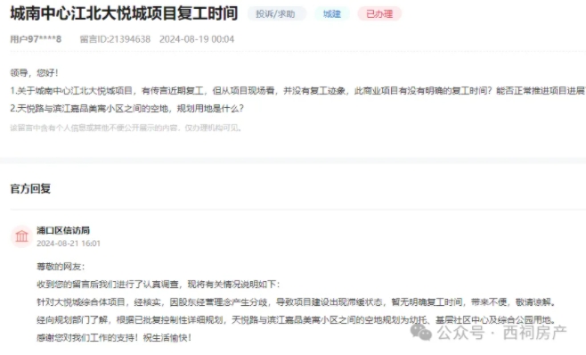 据领导留言板显示,8月21日,官方表示,针对大悦城综合体项目,经核实,因股东经营理念产生分歧,导致项目建设出现滞缓状态,暂无明确复工时间。