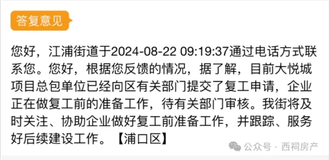 此前(8月22日),南京市浦口江浦街道曾表示:“目前大悦城项目总包单位已经向区有关部门提交了复工申请,企业正在做复工前的准备工作,待有关部门审核。”