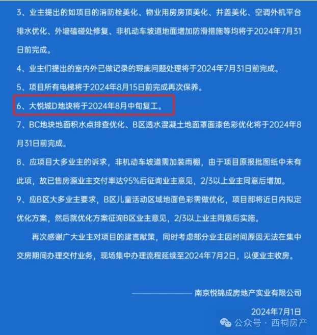 7月1日,南京大悦城开发公司南京悦锦成房地产实业有限公司发布《公告书》,公告书第六条内容为:大悦城D地块将于2024年8月中旬复工。