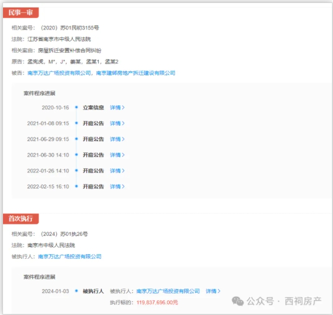 其中因房屋拆迁安置补偿合同纠纷,南京万达广场投资有限公司被南京市中级人民法院强制执行,执行金额近1.2亿!有意思的是被告席上,还出现了南京建邺房地产拆迁建设有限公司(建邺国资全资持有子公司。相关法律文书显示,它亦是南京万达广场投资有限公司的拆迁受委托人)。