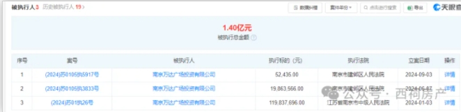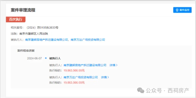 在另一案中,南京万达广场投资有限公司与南京建邺房地产拆迁建设有限公司同为被执行人,被执行近2000万,执行法院为南京市建邺区人民法院。