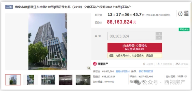 近日,位于河西的南京建邺万达广场一栋办公楼被法拍,评估价格约1.57亿元,起拍价约为8816万元,相当于打了5.6折,竞拍需缴纳880万元保证金,加价幅度为44万元,拍卖时间为2024年9月18日10时至2024年9月19日10时止,截至发稿前,有300多人围观,尚无人报名。