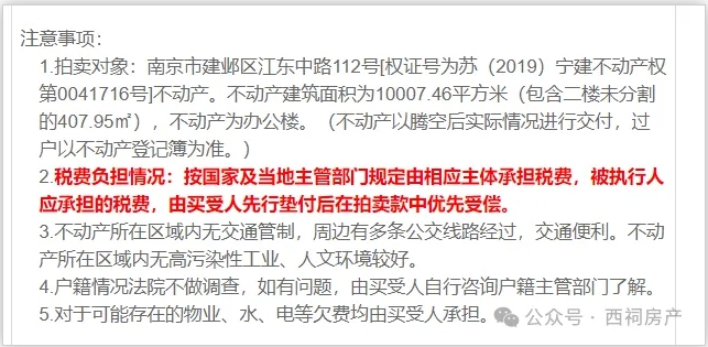 此外,评估报告还显示,根据相关法律文书,该办公楼二楼建筑面积407.95 ㎡补偿给中国农业银行股份有限公司南京雨花台支行。但因原执行法院未明确407.95㎡的具体位置,法院提供的鉴定委托书、不动产登记查询结果、不动产权证也未进行分割,因此本次拍卖评估按照 10007.46㎡面积进行评估。