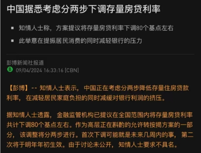 据彭博新闻社消息,金融监管机构已提议在全国范围内将存量房贷利率共计下调80个基点左右。