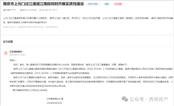 9月26日,江苏省铁路办公室回复表示,南京上元门过江通道为国家发展改革委批复的《长江干线过江通道布局规划(2020-2035年)》中的铁路过江通道,是原中国铁路总公司与江苏省人民政府联合批复的《南京铁路枢纽总图规划(2016-2030年)》中明确的新南京北站至南京站的联络线。南京上元门过江通道拟与南京北站、南京站接轨,目前,南京北站段正在抓紧建设,过江段初步设计工作正在有序推进。本项目引入南京站段的相关方案较为复杂,按照有关部门的要求,已深化开展接轨方案、车站能力适应性、施工期对运输组织及安全影响等专题研究,并根据研究成果开展了多轮路省会商。项目的征拆工作由属地负责,小市新村征拆方案以所在区政府将来正式发布的征地公告为准。