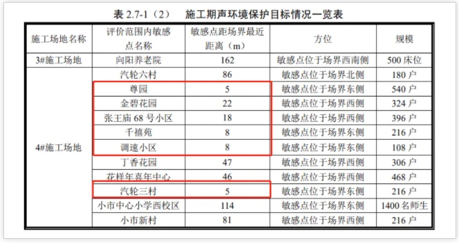 环评报告的表格中标出了各施工场地范围敏感点名称和距离,其中30米以内的建筑物有:尊园、金碧花园、张王庙68号小区、千禧苑、调速小区、汽轮三村等。