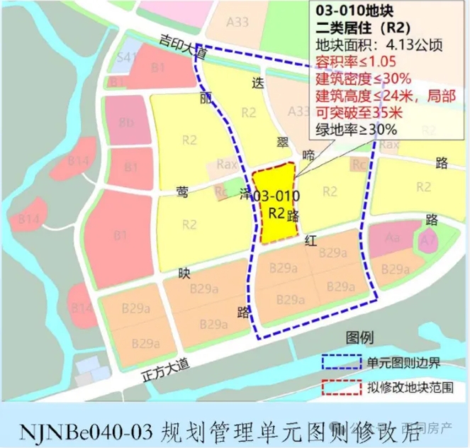 N]INBe040-03规划管理单元图则位于江宁高新区方山南部片区,东至锦岸路、西至丽泽路、南至正方大道、北至吉印大道,用地面积约52.08公顷。