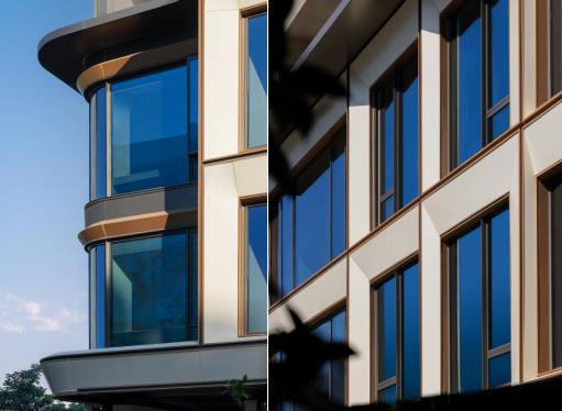 九庐打造南部新城首个立体画框式立面,利用不同程度的斜切面,同时增加圆弧元素,精细化的立体勾边,创造出南京前所未有的三维外观;更创新性地将3000K色温,引入到建筑立面之中,不同于公建化立面的严肃,这种立面给人以温馨之感,舒适而放松。