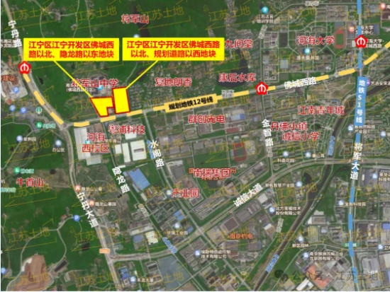 两幅地块位于江宁开发区,佛城西路以北,宁丹大道以东。两幅地块距离重要交通核心节点南京南站直线距离7km,距离南京机场、新街口商圈、夫子庙等均在半个小时车程,交通便利。地块紧邻城市主干道宁丹大道、诚信大道,距离宁宣高速、绕城高速距离高速入口10分钟车程。两幅地块邻近地铁S1号线河海大学·佛城西路站,直线距离2公里,西侧紧邻规划12号线牛首山站,未来公共交通便捷。