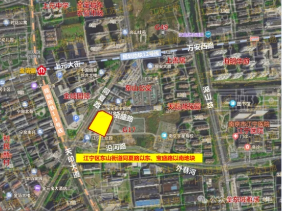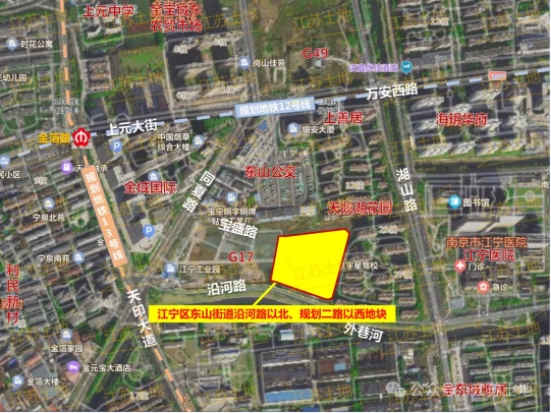 地块位于秦淮河支线外港河畔,自然景观优美。地块周边公共配套完善,周边有上元中学文靖东路小学等优质教育配套,东侧为江宁医院,且有万科金域国际、万科都荟启境花园等多个已建或在建小区,人居氛围浓厚。片区今年已成交1幅宅地,即紧邻本次宅地西侧的G17地块。今年8月,中天美好联合南京上元城市建设以总价4.72亿元摘地,成交楼面价11498元/㎡。该地块开发进度神速,拿地仅1周后规划设计方案已公示,将以错层设计的超大露台,为江宁购房者带来首个“第四代住宅”。本次同步公告的G52社区中心用地,将为东侧的两幅住宅用地提供家门口的便捷生活配套,进一步完善区域内的公共配套。