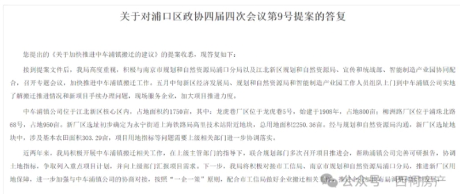 2020年7月29日,“关于对浦口区政协四届四次会议第9号提案的答复”,南京市江北新区管委会经济发展局表示:中车浦镇公司位于江北新区核心区内,占地面积约1750亩,其中:龙虎巷厂区位于龙虎巷5号,始建于1908年,占地800亩;柳洲路厂区位于浦珠北路68号,占地950亩。新厂区选址初步确定为永宁街道上海铁路局高里技术站附近地块,总用地面积2250.36亩。经与规划和自然资源局沟通,新厂区选址地块中,涉及基本农田面积303.29亩,项目用地指标等问题需要上级相关部门进一步协调落实。