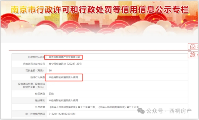 近日,据信用南京显示,南京凤翔房地产开发有限公司被南京市雨花台区住房和建设局罚款30万元,违法行为类型为未经消防验收擅自投入使用,处罚依据为《中华人民共和国消防法》第十三条第三款、《中华人民共和国消防法》第五十八条,处罚决定日期为2024年11月5日 。