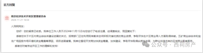 11月21日,南京经济技术开发区管理委员会回复:“招商部门正在利用现有载体空间积极对接优质的商业资源,争取尽快在片区商业导入方面取得突破。五矿商业综合体和宝龙广场因受市场环境和资金筹集等原因,项目进展缓慢。我单位督促开发商加快资金筹集,加快建设,争取尽快取得实质性进展,为群众创造优良的区域商业配套服务。”