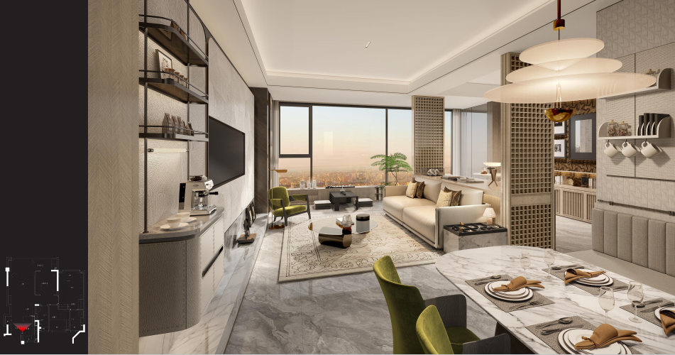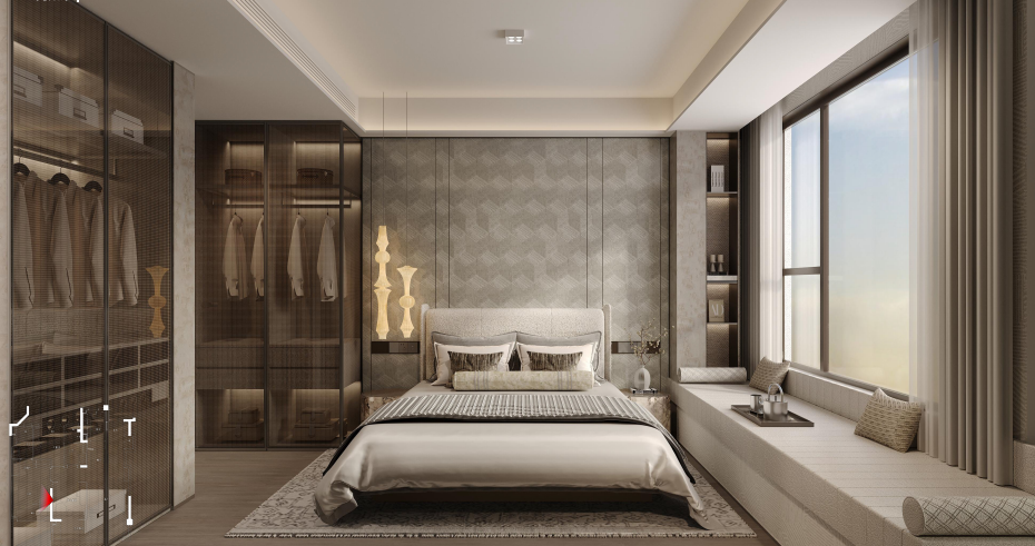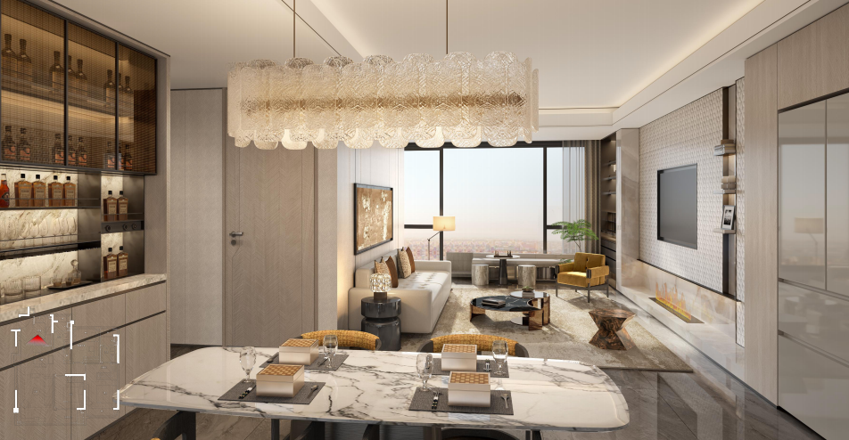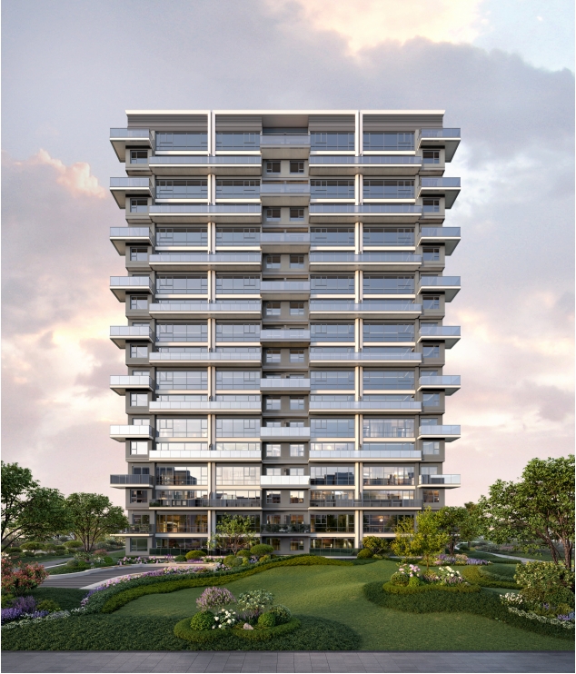 中轴对称层叠式光幕立面,宛如一颗海棠树扎根向下,挺拔向上,仪表棠棠,极具进取攀登之意;香槟金暖色调铝板线条,流淌着沉静而温暖、现代而时尚的艺术美感;约0.52超大窗墙比、光景落地窗带来极致采光与观景视野,让完满生活向阳生长。