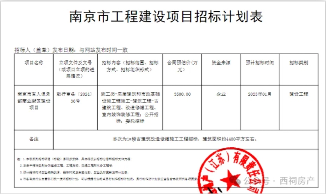 南京市军人俱乐部商业街区建设项目:本次为1#楼古建筑改造修缮施工工程招标,建筑面积约4400平方左右,合同预估价为3500万元。