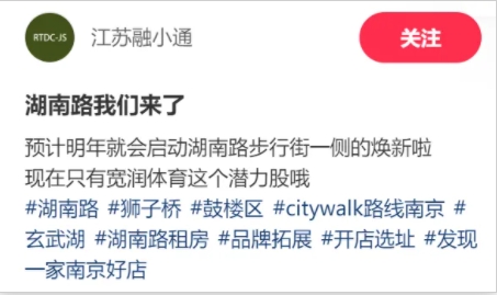 近日,融通地产在小某书上发布重要消息:预计明年启动湖南路步行街一侧焕新!目前已计划启动招商,后面会陆续发布各项规划!