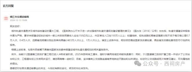 12月13日,镇江市交通运输局回复表示:句容市目前暂不具备向国家发改委申报建设城市轨道交通规划的相关基础条件。