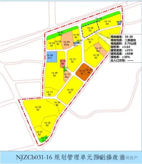将原 16-30地块二类居住用地(R2)切分为两个地块,其中:东侧地块用地性质为文物古迹用地(A7),用地编号为 16-30,容积率≤0.5,建筑密度≤45%,建筑高度≤12 米,绿地率≥20%,出入口方向S;西侧地块用地性质为街旁绿地(G1c),用地编号为 16-31,绿地率≥65%。