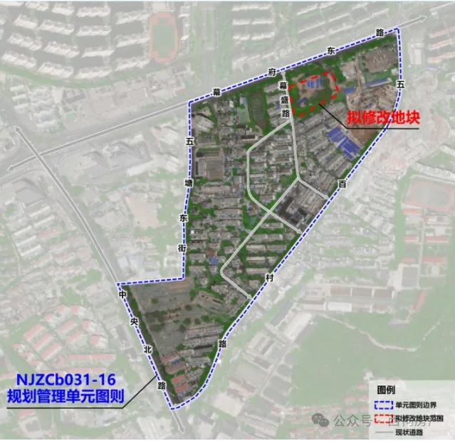 NJZCb031-16规划管理单元范围北至幕府东路,西至五塘东街、中央北路,东南至五佰村路,总用地面积约28.87 公顷。