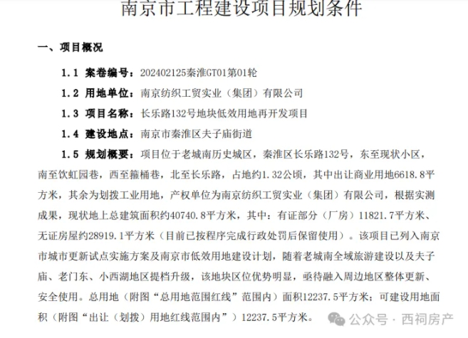 据项目规划条件显示,项目位于老城南历史城区,秦淮区长乐路132号,东至现状小区, 南至饮虹园巷,西至箍桶巷,北至长乐路,占地约1.32公顷,其中出让商业用地6618.8平 方米,其余为划拨工业用地,产权单位为南京纺织工贸实业(集团)有限公司,根据实测成果,现状地上总建筑面积约40740.8平方米,其中:有证部分(厂房)11821.7平方米、 无证房屋约28919.1平方米(目前已按程序完成行政处罚后保留使用)。该项目已列入南京市城市更新试点实施方案及南京市低效用地建设计划,总用地面积12237.5平方米;可建设用地面积12237.5平方米,分为A、B两个分区。