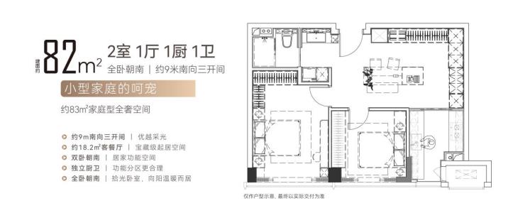约82平的户型,是2室1厅设计,不仅全卧朝南,还做到了南向三约9米开间,具备非常优越的采光,空间的舒适度和尺度,对于一个小型家庭来说绰绰有余。整体是去客厅化的设计,空间配色基调沉稳高级且充满生活品质感。