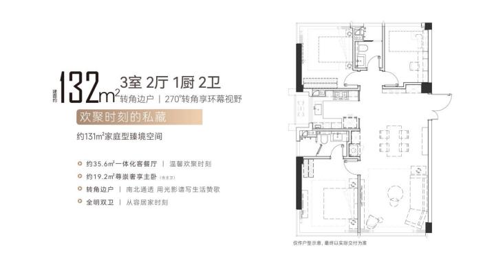 约132平的户型,做到3室2厅2卫,因为都是转角边户,采光和通风都非常好,客餐厅面积超18㎡,主卧带独立卫浴,空间感和尺度都做的很到位,完全可以满足三代同堂的居住需求。海派风情的装修,高雅艺术感十足,更是加了不少分。这个户型也是热度很高的一个户型,肯定是不愁卖。